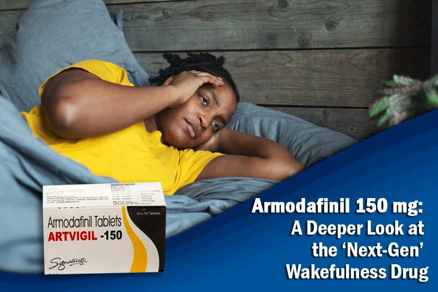 Armodafinil 150 mg (Artvigil-150) tablet pack shown beside a person struggling with wakefulness.